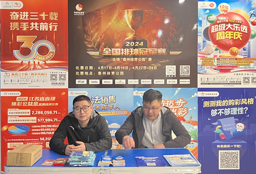 泰州体彩抓住全国排球冠军赛的契机,一方面,在赛事活动入口处搭建宣传展示平台,制作宣传展示板,印发非理性购彩指导手册、安全生产指导手册等,向大家介绍中国体育彩票全国统一上市30年,筹集体彩公益金助力群众体育设施建设,全民健身活动开展,体育运动健儿赛场争金夺银作出重要贡献。另一方面,在赛场周边,通过LED电子屏进行中国体育彩票全国统一上市30年宣传,传递国家公信公益体彩品牌价值。同时,邀请观众参与“购彩风格测试”,广泛宣传“公益体彩 乐善人生”的品牌理念,强化“快乐购彩、理性投注”的责任彩票意识,有力营造了“体彩+赛事”品牌宣传新路径。