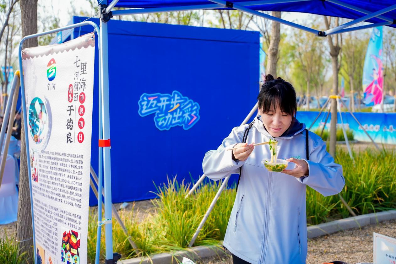 天津市非物质文化遗产、七里海河蟹面代表性传承人于德良在活动现场支起“小吃摊”,汤汁鲜美的河蟹面吸引不少人品尝、购买。“来赛场参展不虚此行,我看到了奥运冠军,还跟着走了一会儿锻炼身体。最重要的是能让更多人品尝到七里海的乡土特产,希望以后这样的比赛能多一些。”于德良说。
