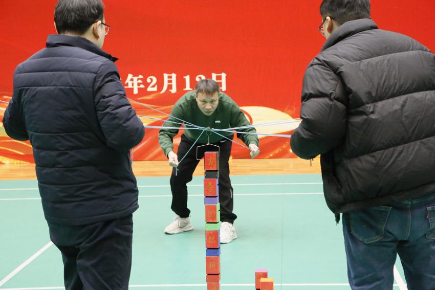 紧接着,趣味游戏环节精彩上演,将联谊会氛围推向高潮。“重走长征路”“一路战到底”“默契猜猜猜”“齐心筑高塔”“共赴新征程”五个趣味游戏依次开展,赛场上欢声笑语不断,既有紧张激烈的比拼,更有团结协作的温暖。游戏过程中,联合第一党支部选手生动诠释“联合”内涵,心往一处想、劲往一处使,展现了体育人昂扬向上、奋勇拼搏、团结协作的良好精神风貌,在游戏中放松了身心、增进了情谊。