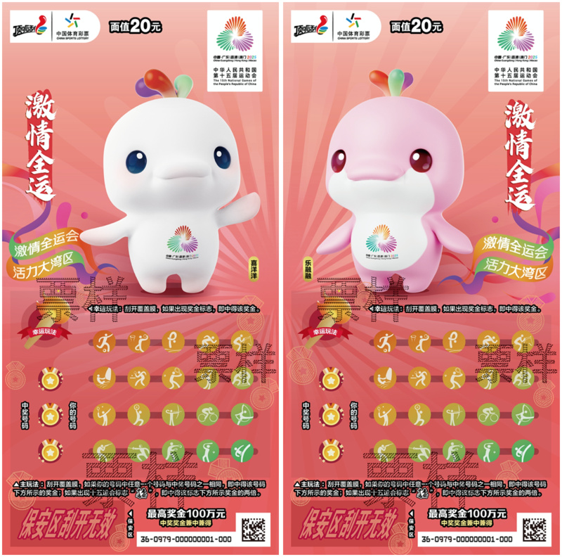 “激情全运”面值20元,共有6个票面场景。票面以十五运会吉祥物“喜洋洋”“乐融融”为核心,融入赛事会徽与“激情全运会 活力大湾区”主题口号。清新活泼的设计风格,配以十五运会项目图标刮奖区,淋漓尽致地展现了青春活力与竞技激情。