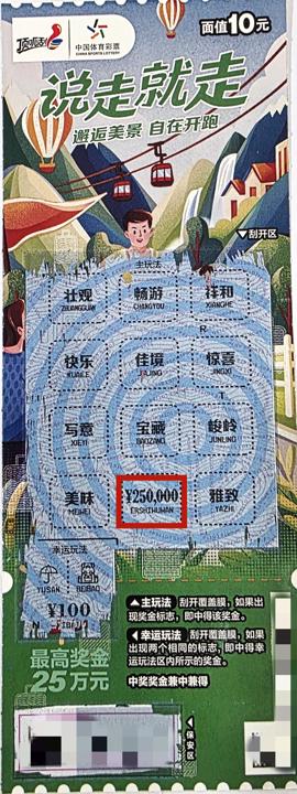 “完全是意料之外的惊喜!”王先生难掩激动,话语里还带着几分未平复的雀跃。他回忆道前一晚下班路过家附近的体彩实体店时,本只是抱着“随手试试”的心态购彩,没想到刚一进门就被“说走就走”系列的票面设计牢牢吸引。“画面特别有质感,绿色背景搭配旅行元素,看着就很治愈,刚好最近也在琢磨要不要出去放松一下,就顺手买了一张。” 刮开涂层的瞬间,数字“250000” 跃入眼帘,王先生愣了几秒才反应过来,反复确认多次后才敢相信这份幸运真的降临在自己头上。