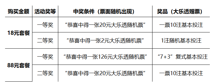 除了可以参与“线上扫码验奖”活动,江苏购彩者还可以同步畅享专属的800万赠票活动。活动期间,凡在江苏省内销售网点采用18元、88元“幸运套餐”投注方式购买大乐透,如在票面出现中奖文字的,即可获取对应赠票奖品。具体如下: