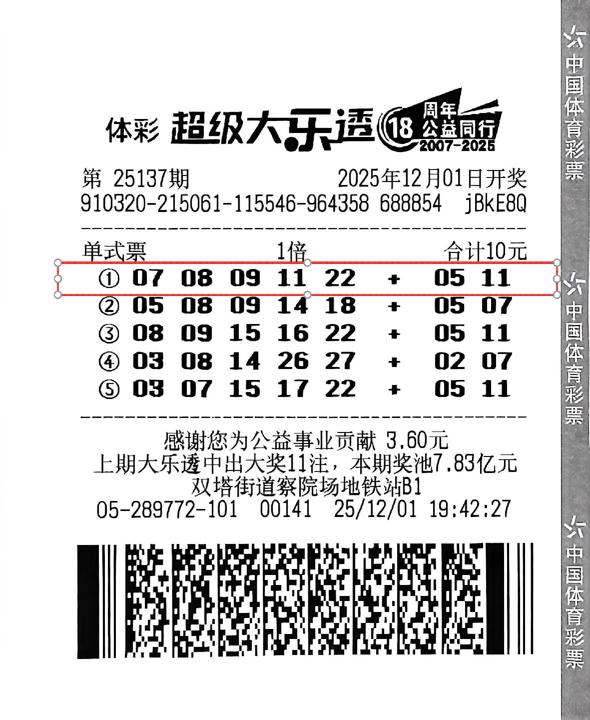 据了解,张先生的购彩习惯随性且灵活,只是将购彩当作生活中的轻松调剂。在选号方式上,他兼顾“坚守”与“随缘”,既会长期坚持守号,保留对固定号码的期待,也会偶尔选择随机投注,增添不确定的中奖机会。此次中奖,正是他坚守的号码带来了好运,票面第一注号码“07、08、09、11、22+05、11”收获了一等奖,同时第三注中得1注六等奖、第五注中得1注八等奖、第二注中得1注九等奖。谈及中奖后的心情,张先生难掩喜悦,直言这份幸运来得意外又珍贵,目前还没有想好奖金的使用计划。他表示,未来会继续保持现有的购彩节奏,在享受守号与随机投注双重乐趣的同时,也为体彩公益事业持续贡献自己的一份力量。