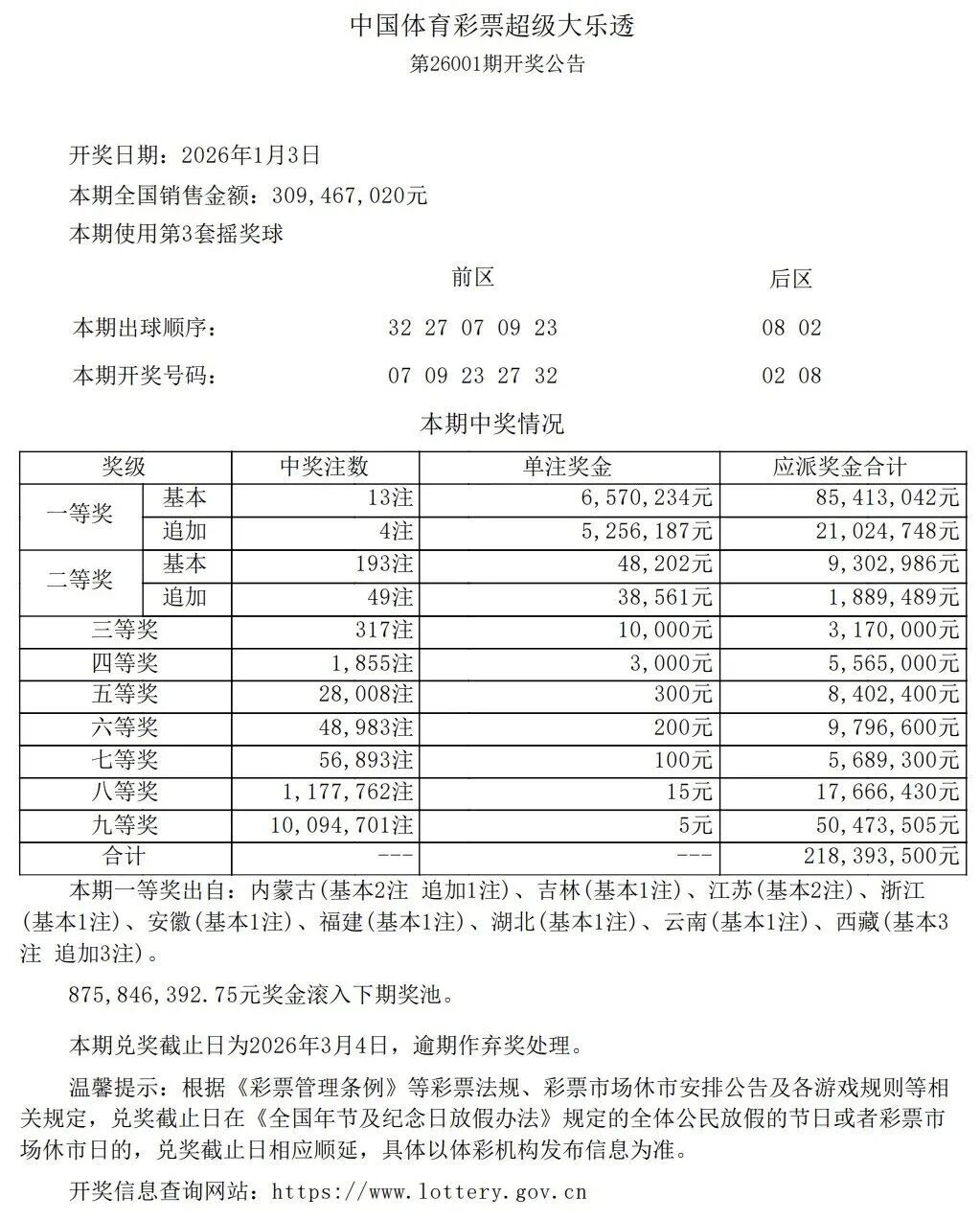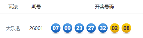 1月3日,超级大乐透第26001期开奖。前区开出号码07、09、23、27、32;后区开出号码02、08。本期全国销售3.09亿元,为国家筹集彩票公益金1.11亿元。