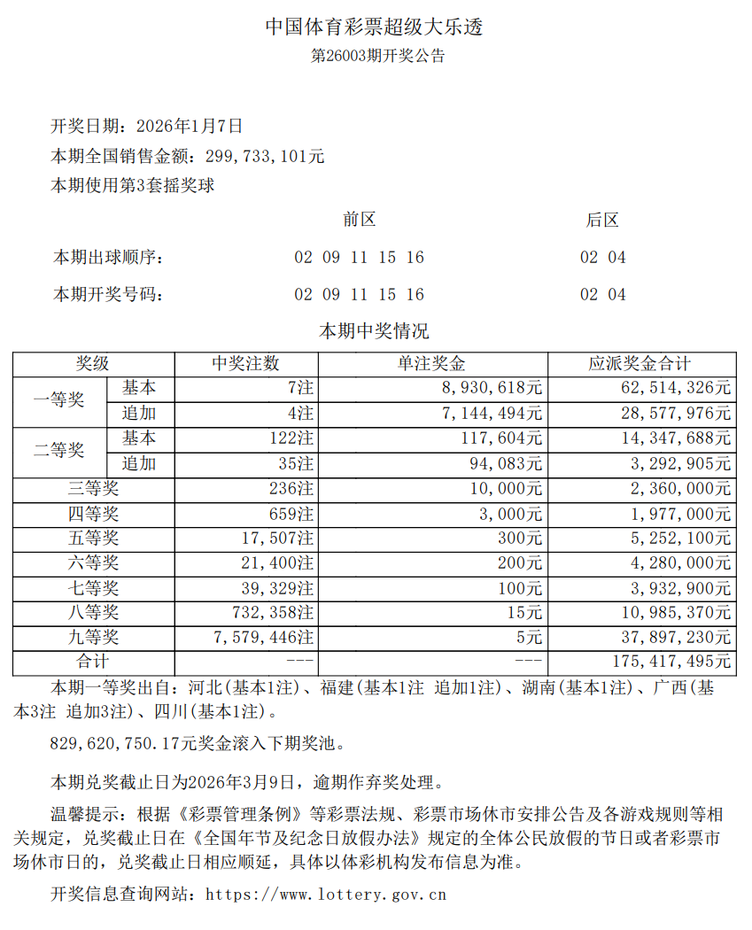 1月7日,超级大乐透第26003期开奖。前区开出号码02、09、11、15、16;后区开出号码02、04。本期全国销售2.99亿元,为国家筹集彩票公益金1.07亿元。