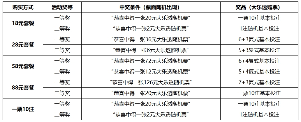 本次1500万元赠票活动自大乐透第26026期(2026年3月11日21:10开售)至第26039期(2026年4月13日21:00止售),活动期间,凡在江苏省内销售网点采用四种“幸运套餐”、“一票10注”投注方式购买大乐透(含预售票,多期票仅首期参与,补打票不参与),如在票面出现中奖文字的,即可获取对应赠票奖品。具体如下: