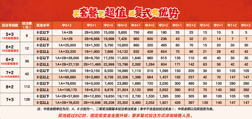 答:新规则下,大乐透套餐票和复式票的参与体验进一步提升。尤其是当奖池超过8亿元,三至七等奖奖金上浮时,采用复式或套餐投注的购彩者一旦中奖,很可能同时命中多个奖项,形成“奖金叠加”效应,中奖惊喜加倍!