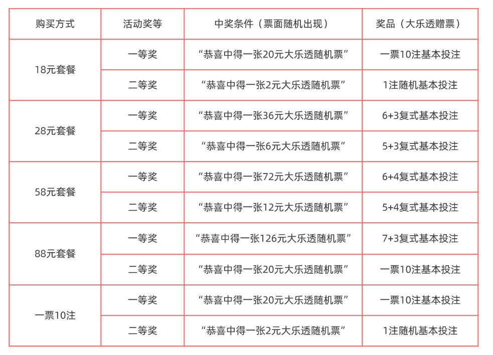 本次1500万元赠票活动自大乐透第26026期(2026年3月11日21:10开售)至第26039期(2026年4月13日21:00止售),活动期间,凡在江苏省内销售网点采用四种“幸运套餐”、“一票10注”投注方式购买大乐透(含预售票,多期票仅首期参与,补打票不参与),如在票面出现中奖文字的,即可获取对应赠票奖品。具体如下:
