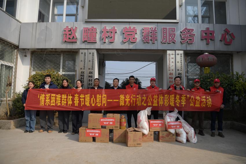 为深化党建引领,践行公益使命,助力乡村振兴,春节前夕,徐州市体彩中心党支部组织“体彩先锋”志愿服务队与徐州经济技术开发区徐庄镇赵疃村党支部,以“党建引领•公益惠民——体彩助力乡村振兴”为主题开展结对共建暨春节前走访慰问志愿服务活动。赵疃村党支部书记及村委会成员陪同参与。