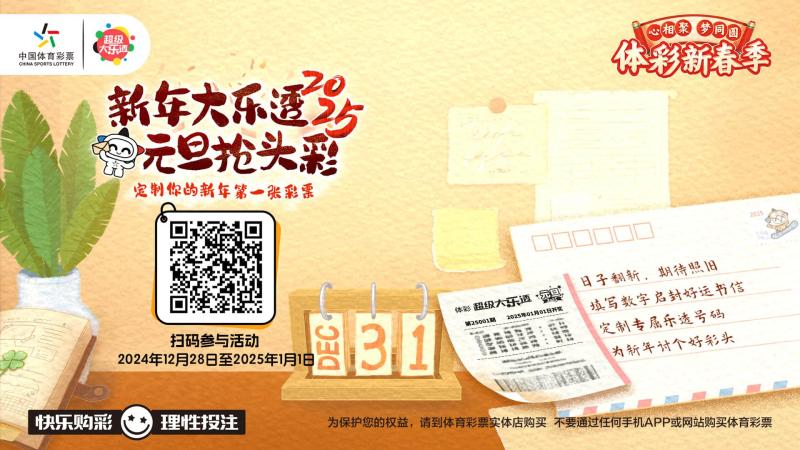 在蛇年新春即将来临之际,超级大乐透带着满满的祝福再次和你相约。2025年1月12日至1月26日期间(超级大乐透第25006期至25011期),超级大乐透套餐票将连续推出6期“限定版”新年主题票面,记录每一个温馨的新年故事,让爱在这个新春佳节里温暖传递。在此期间,通过“中国体育彩票”小程序或APP扫描这6期指定奖期(第25006期至第25011期)的大乐透套餐票底部二维码,还有机会获得照片打印机、旅行箱等新春精美礼品。
