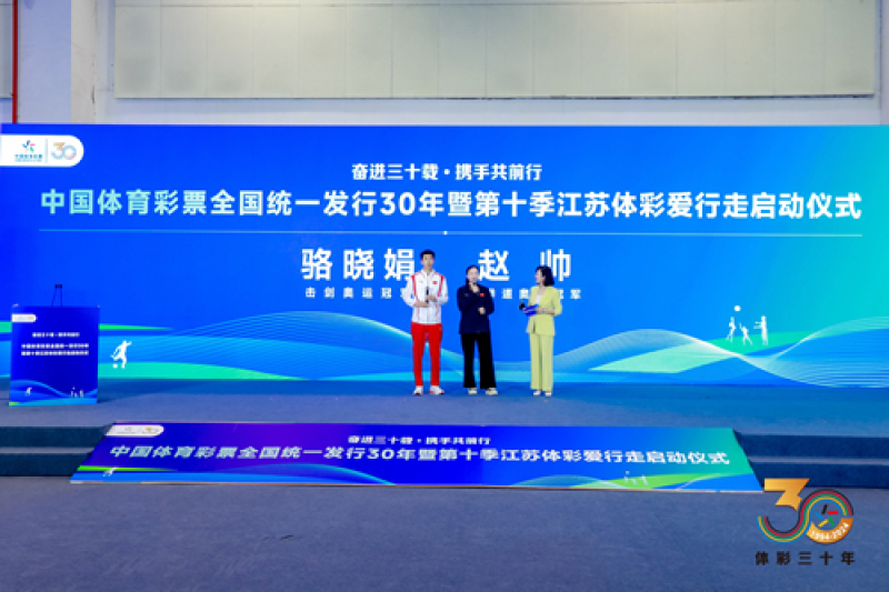 ●2024年10月12日,中国体育彩票全国统一发行30年暨第十季江苏体彩爱行走启动仪式在苏州举行,奥运冠军骆晓娟、赵帅参与活动。