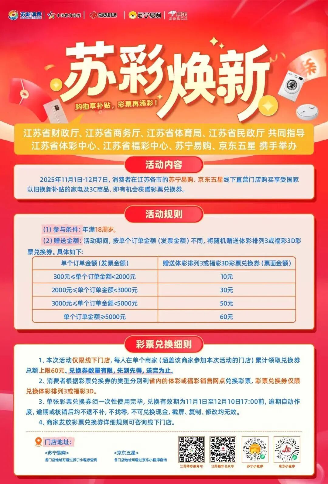 11月1日—12月7日,“苏新消费·苏彩焕新”第四期活动将全面开展。活动期间,年满18周岁的消费者,在江苏省内13个设区市的苏宁易购、京东五星线下直营门店购买享受国家以旧换新补贴指定商品(家电、3C商品),即有机会按单个订单消费金额(发票金额)获赠不同面值的彩票兑换券。其中,体彩赠送的是排列3彩票兑换券,兑换券以二维码形式发放。具体如下: