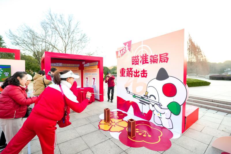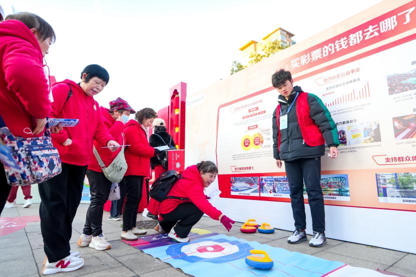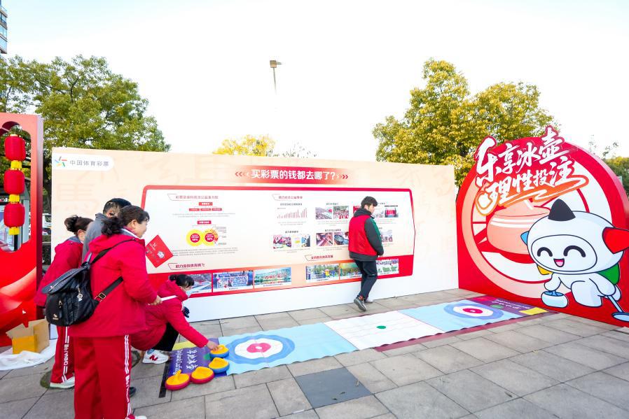 江苏省体彩中心已连续多年支持全国新年登高健身大会江苏分会场活动,今年的活动现场,中国体育彩票元素随处可见,除了以道旗、展板等形式向公众传递体彩公益理念,还设立以“安心购彩守护行动”为主题的互动区域,精心设计“乐享冰壶 理性投注”旱地冰壶游戏、“瞄准骗局 重箭出击”趣味投壶游戏和“远离圈套”趣味套圈游戏,吸引众多登高群众踊跃参与。参与者每完成一项互动游戏可获得对应印章,集齐印章后即可兑取纪念品。趣味横生的互动游戏将理性购彩理念融入欢乐健身氛围,通过“反诈宣传”“理性购彩引导”“风险提示”等形式生动普及购彩知识,提升公众防范涉彩诈骗意识。