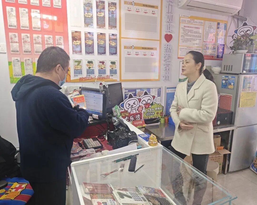 在合规经营督导方面,检查组严格核查站点代销证公示、理性购彩宣传专栏设置等情况,重点排查是否存在违规销售、虚假宣传、赊销彩票等行为,严禁未成年人购彩,强调规范销售对体彩事业高质量发展的重要性。同时,检查组还与站点负责人、销售人员深入交流,认真倾听大家在实际运营中遇到的困难和意见建议,对一线从业者坚守岗位、默默付出表示感谢,并送上节日的诚挚问候。
