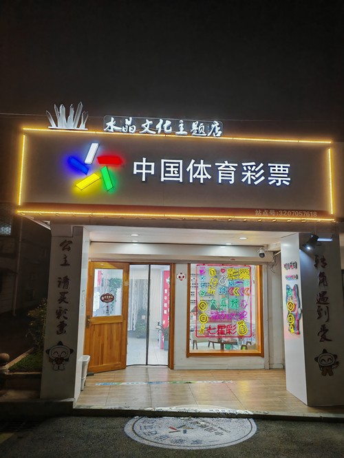 该网点位于东海县金牛公园附近,地理位置得天独厚,店外的设计独具匠心。门头上方,悬挂着用宛如水晶簇效果制作的异型灯,璀璨夺目。门柱上装饰着 “公主请买彩票”“转角遇到爱” 等趣味十足的字样,还有哆啦A梦和乐小星等彩灯。